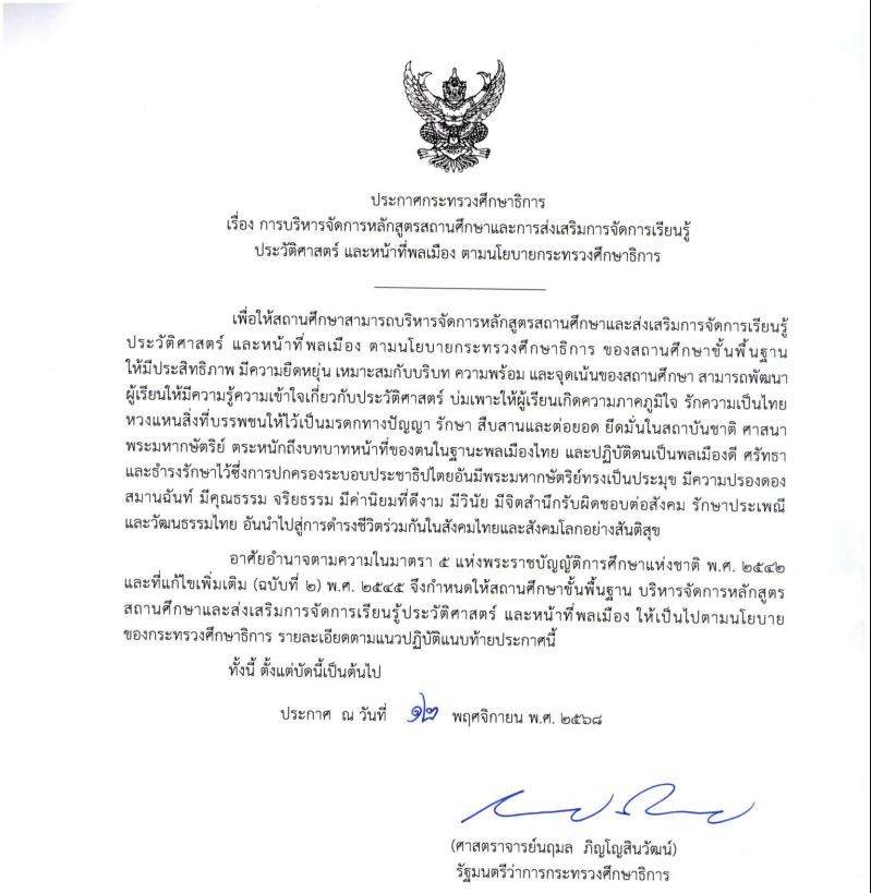 กลางเดือนพฤศจิกายน 2568 กระทรวงศึกษาธิการ ภายใต้การกำกับของ ศาสตราจารย์ ดร.นฤมล ภิญโญสินวัฒน์ ได้ออกประกาศกระทรวงศึกษาธิการเรื่อง “การบริหารจัดการหลักสูตรสถานศึกษาและการส่งเสริมการจัดการเรียนรู้ ประวัติศาสตร์ และหน้าที่พลเมือง ตามนโยบายกระทรวงศึกษาธิการ”